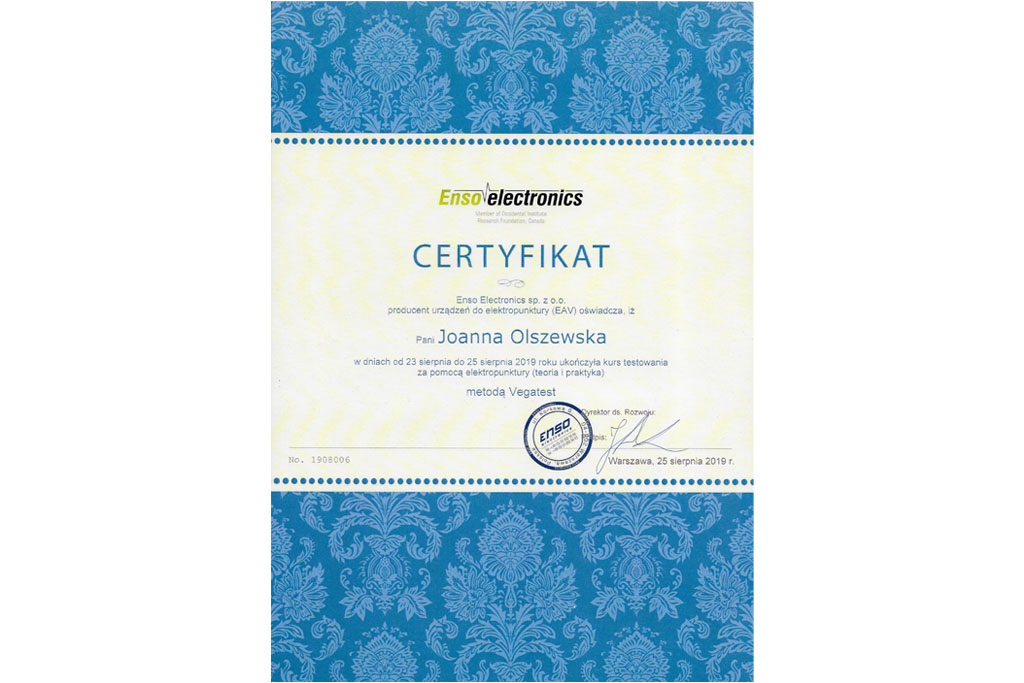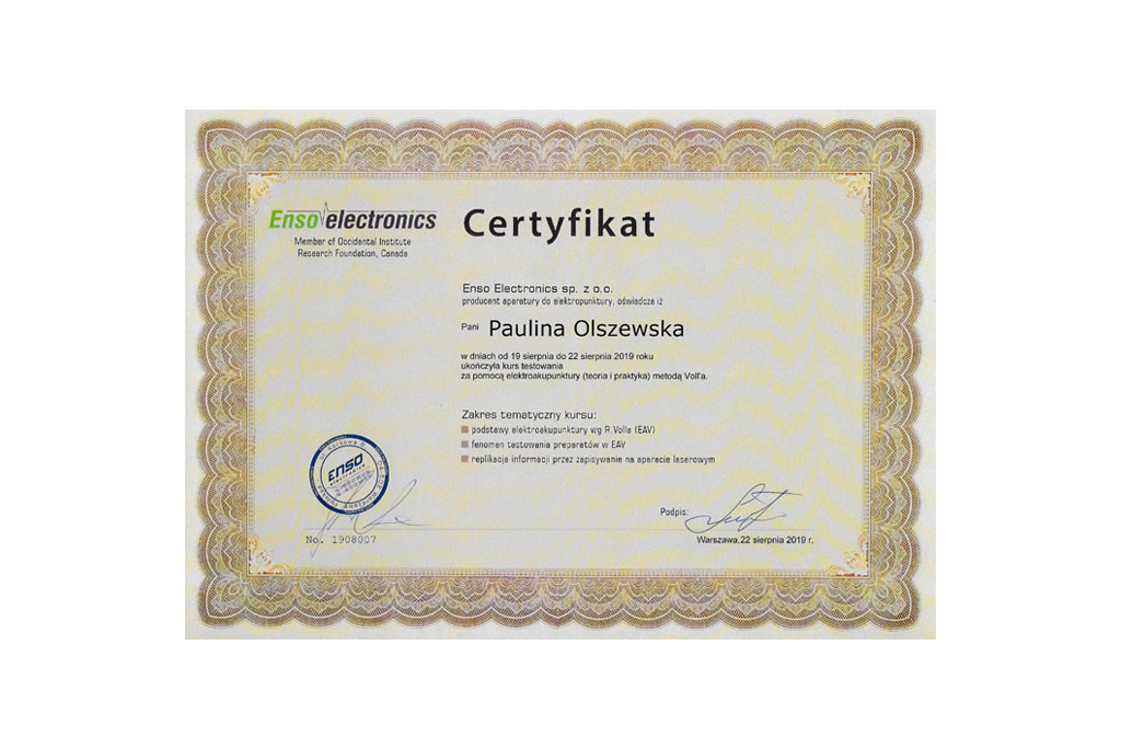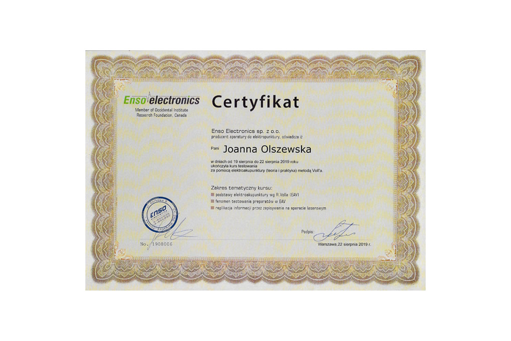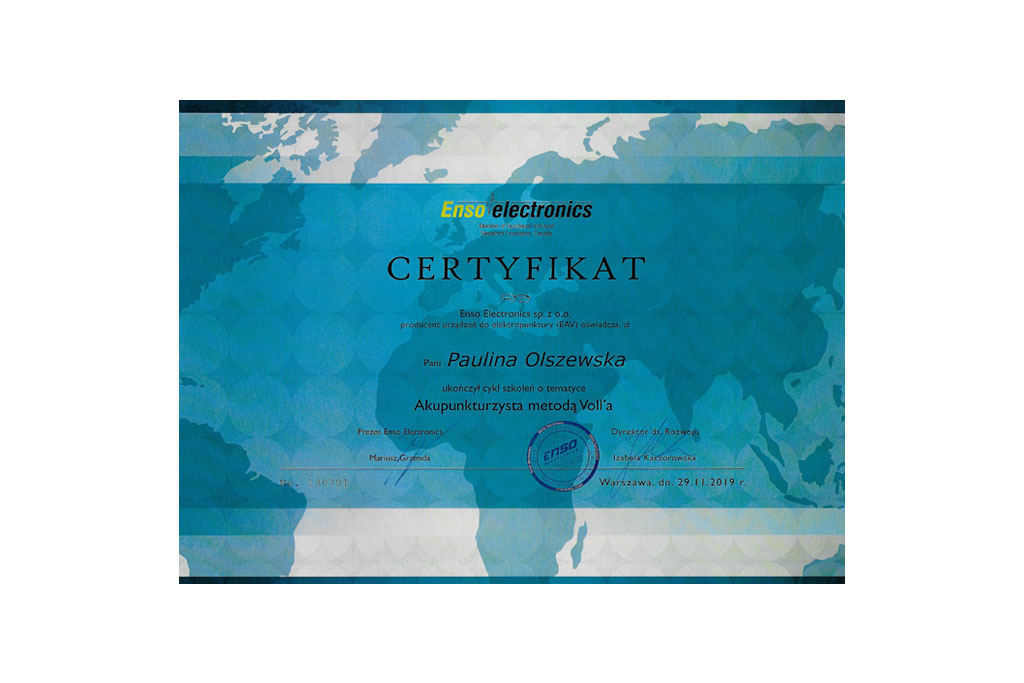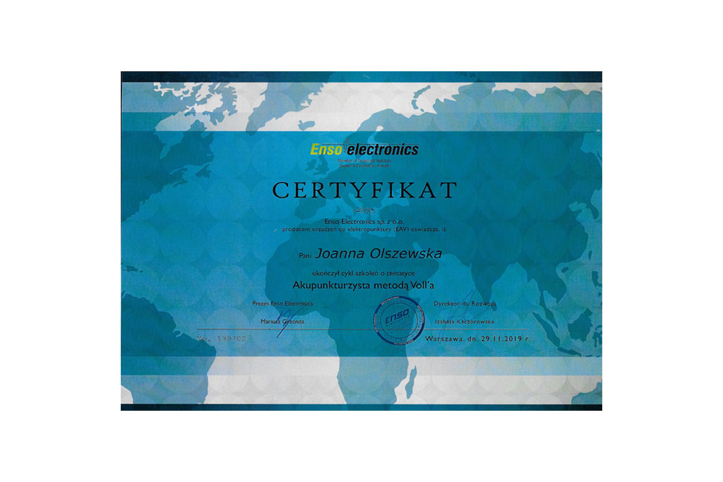 Certyfikat - Akupunkturzysta metodą Voll'a