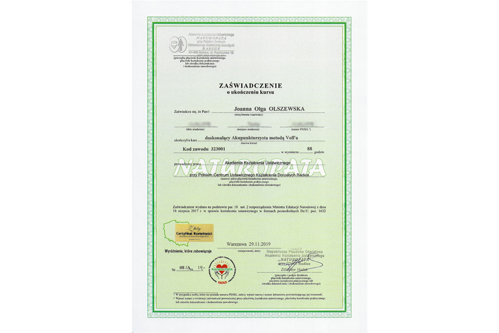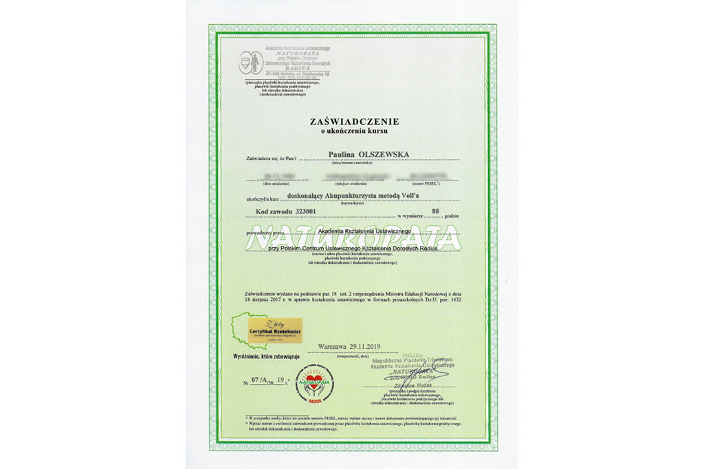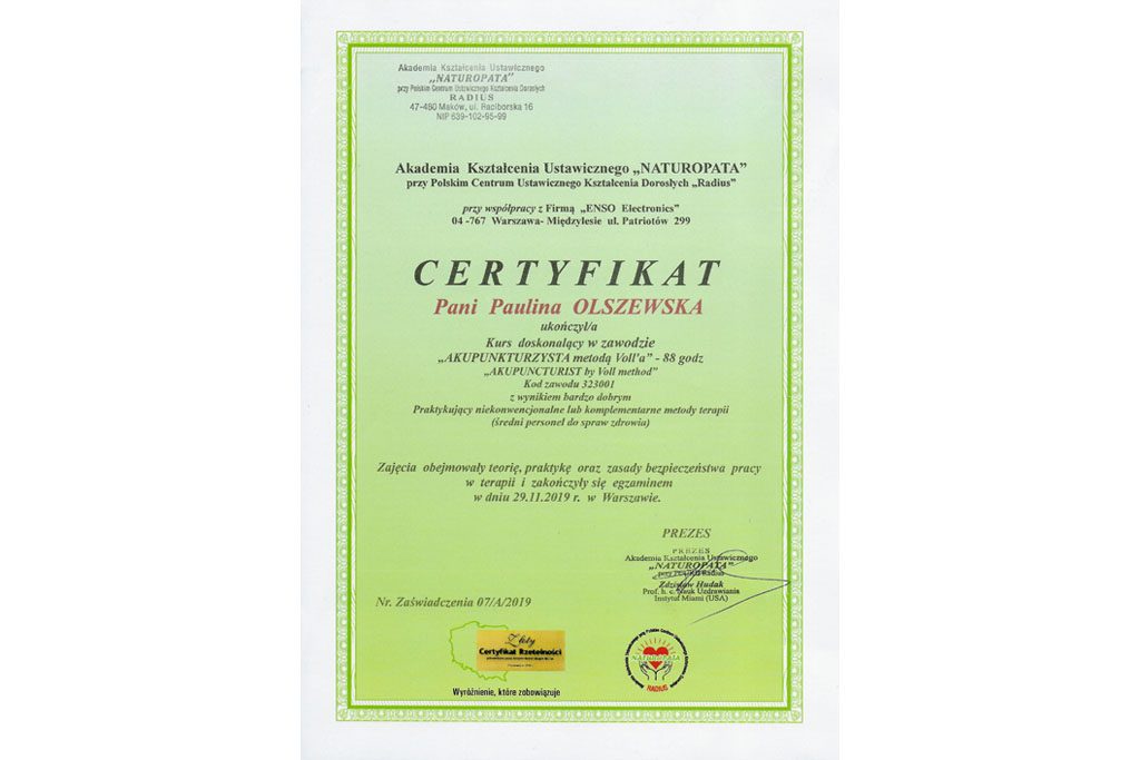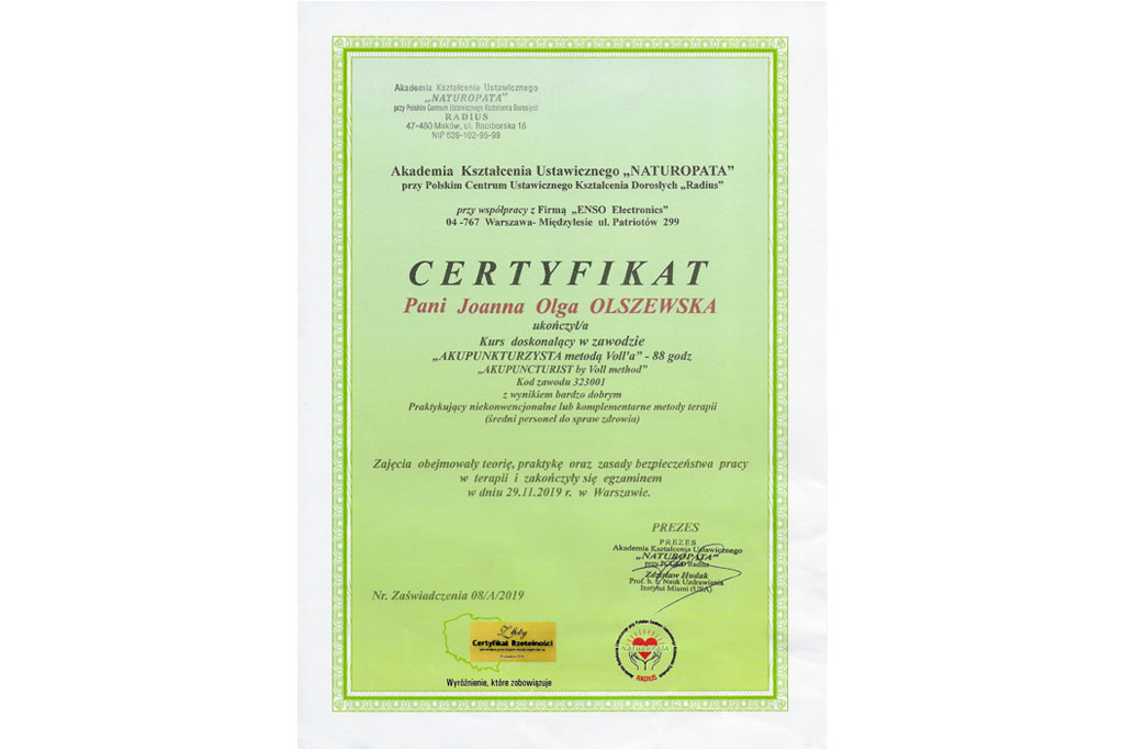 Zaświadczenie - Akupunkturzysta metodą Voll'a
