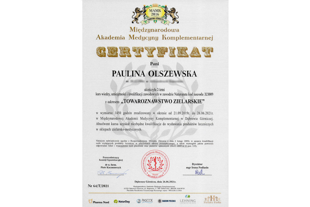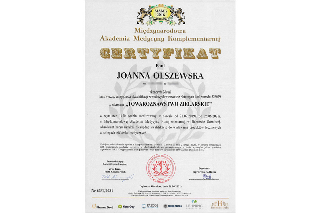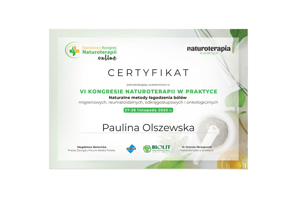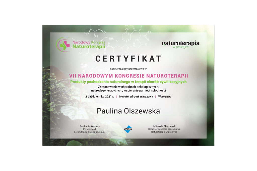 Certyfikat - produkty pochodzenia naturalnego w terapii chorób cywilizacyjnych