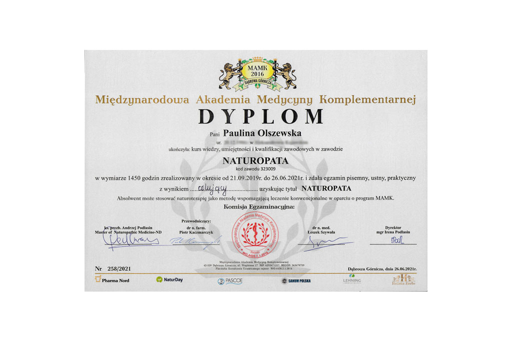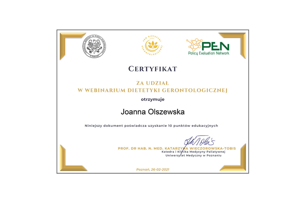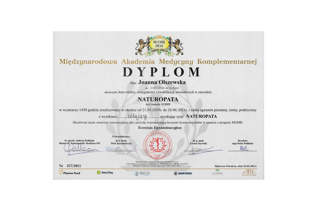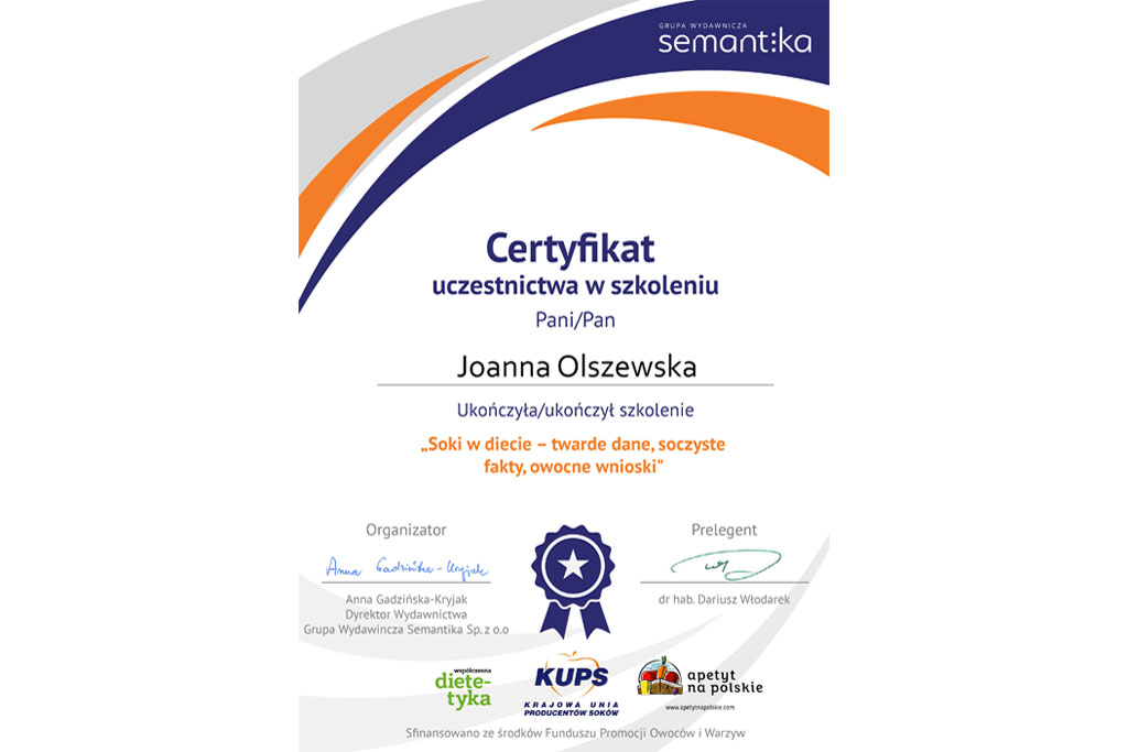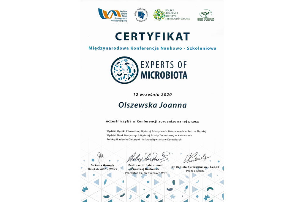 Certyfikat - produkty pochodzenia naturalnego w terapii chorób cywilizacyjnych