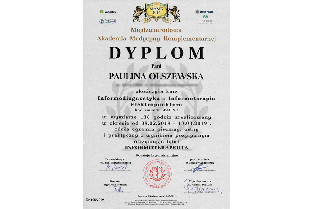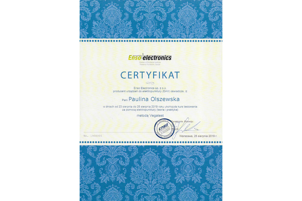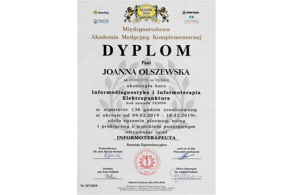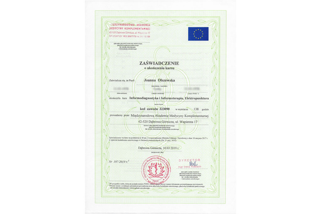Zaświadczenie - Informodiagnostyka i Informoterapia, Elektropunktura