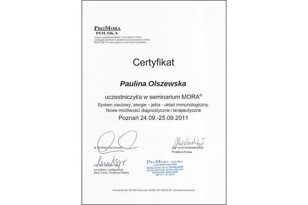 Certyfikat - MORA - nowe możliwości diagnostyczne i terapeutyczne